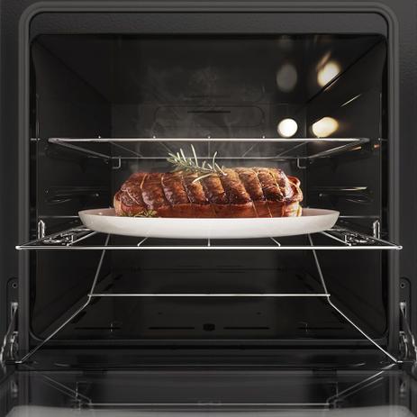 Com porta de acabamento superior full glass, o fogão Electrolux permite melhor visibilidade do interior do forno, além de ser bastante elegante, valorizando seu produto. A limpeza desse fogão também possui características que auxiliam sua tarefa, com grades individuais que impedem os líquidos derramados de se espalharem pela mesa e o vidro interno do forno removível, para uma limpeza mais eficiente.